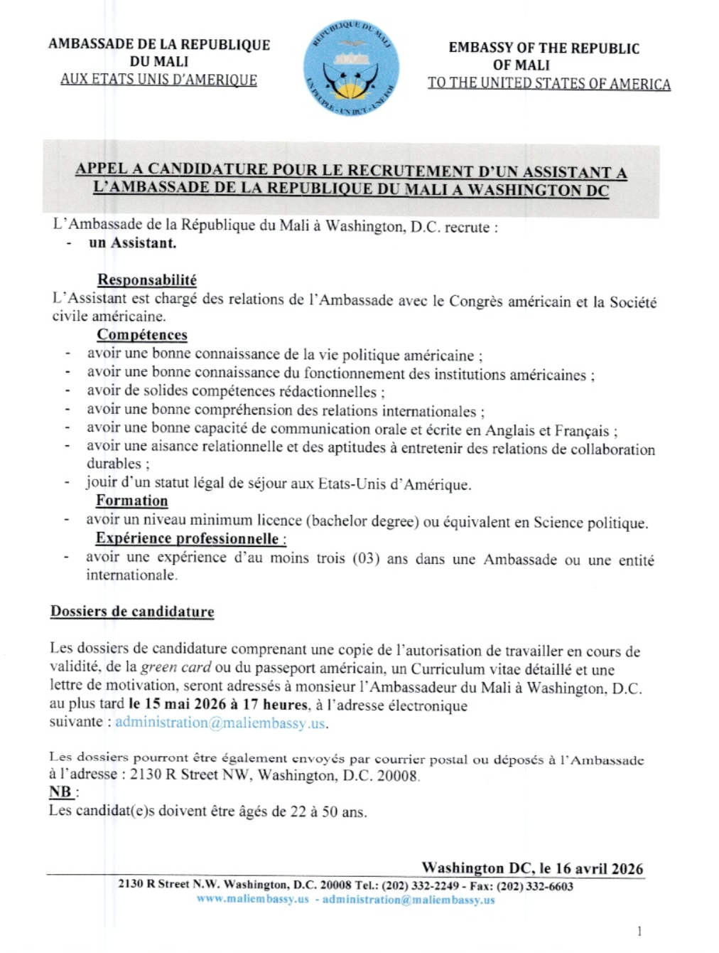 Appel à candidatures : l’Ambassade du Mali à Washington recrute un Assistant